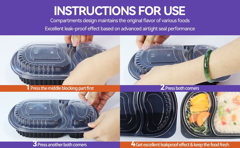 1. Is féidir ár mboscaí lóin indiúscartha a chruachadh chun spás a shábháil le haghaidh póstaí, scoil, cóisirí, turais agus bialanna, etc., agus chun taithí áisiúil a thabhairt duit. Dún an clúdach go tapa agus pacála go héasca sailéid, borgairí, cácaí, rís agus go leor eile.